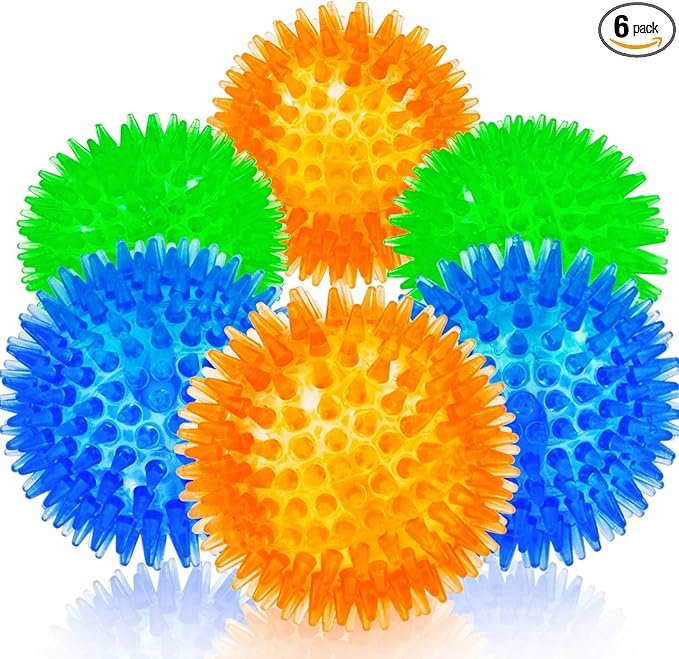 • Bolas de chiado para cães: Há um rangido profundo oculto no interior, o que significa que o cão dificilmente o apertará ao mastigar ou brincar, sem criar perigo de asfixia. Não importa o quanto o seu cão morde, a bola pontiaguda continuará a criar um som bonito que não será muito forte, mas que ainda atrairá a atenção do seu cão.